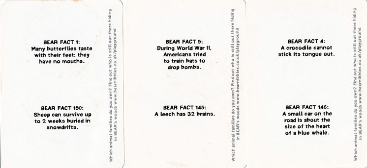 The backs of the cards were somewhat plain, and consisted of two interesting animal facts per card. The reverse of three cards is shown below: